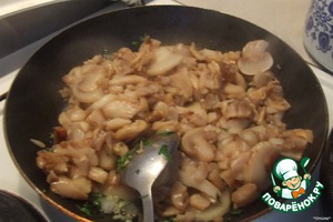 Шампиньоны выложить в сковородку к луку и петрушки и чутьчуть обжарить (примерно 5 минут).