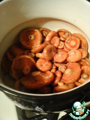 В кастрюлю влить воду, всыпать соль и прокипятить до полного растворения соли. В кипящий рассол засыпать рыжики и варить, помешивая, 10-15 минут с момента закипания.