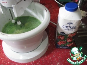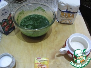 Я замешивала в комбайне. Вылить шпинатную воду в чашу комбайна, добавить 2 стакана молока, соль, сахар, разрыхлитель, и постепенно всыпать муку. Все тщательно перемешать.
