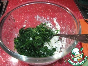 Теперь готовим вторую начинку. У меня сербская брынза (в рассоле), 250 г. Разминаем вилкой, добавляем мелко резанную зелень (какая у вас есть), без стеблей и 4 зубчика чеснока.