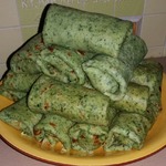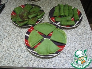 Рецепт таких красивых и вкусных блинов ( без начинки), нашла в журнале ПРИГОТОВЬ. Хочу поделиться и подробно показать как у меня это получилось. Я использовала 2 начинки. Первая (что в конвертиках), это из зеленого лука с яйцом. Вторая начинка с брынзой, зеленью (петрушка, укроп, кинза), и чесноком. Шпинат придает блинам потрясающий вкус. Я использовала замороженный шпинат. Не все фото получились, т. к. сели батарейки в фотоаппарате. На сайте есть один рецепт зеленых блинов, но тесто отличается от моего. Количество я увеличила вдвое, предполагая два вида начинки.