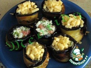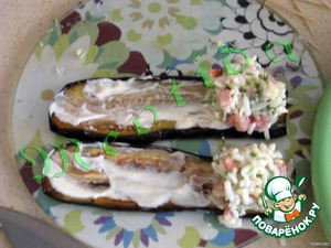 баклажанчики смазать майонезом, из рисовой начинки сформировать шарики и положить на баклажанчик