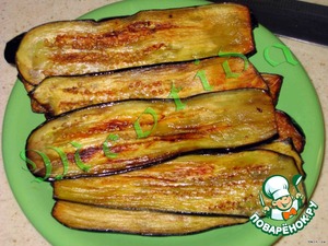 баклажан нарезать полосками, посолить и положить на дуршлаг на 30 минут. вымыть под холодной водой и обжарить с двух сторон. обсушить на бумажных полотенцах или салфетках от излишек масла