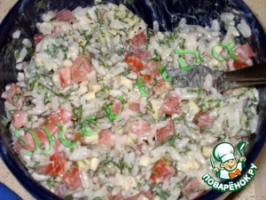 укроп, чеснок, рис, помидор (мелко кубиками порезать) смешать с 1 стол.л. майонеза