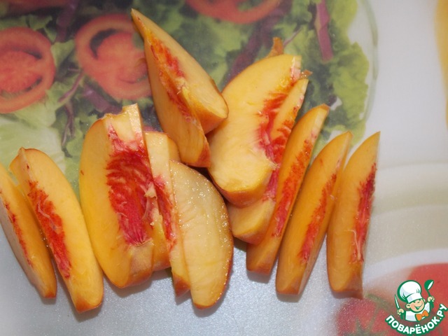 • Персик порезать на небольшие ломтики. Можно больше положить персиков, можно меньше. Я положила 1 персик.