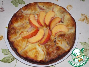 Нежный шоколадный пирог, с сочными персиками под сметанной заливкой. Очень вкусно.