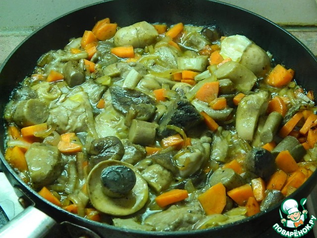 Чудесное ароматное горячее блюдо с насыщенным вкусом, не претендующее на чрезмерную оригинальность. :) Благодаря Поваренку я научилась и полюбила готовить. А этот рецепт - первый, который я решилась выставить, так что не судите слишком строго. Процесс зафотографирован не полностью, так как я не сразу сообразила взяться за фотоаппарат. Найден он на просторах интернета, автор Наталья Радова.