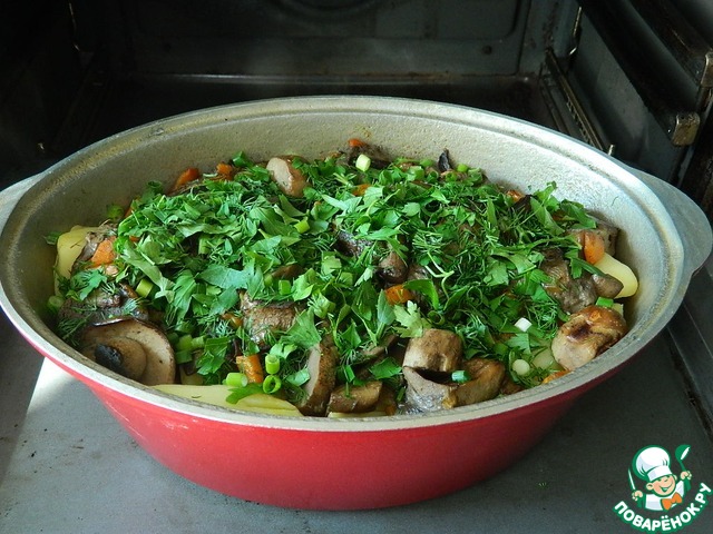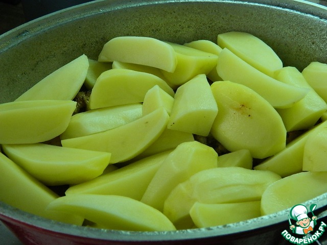Складываем в жаровню (казан, утятницу, любую большую жаропрочную посуду с крышкой). -