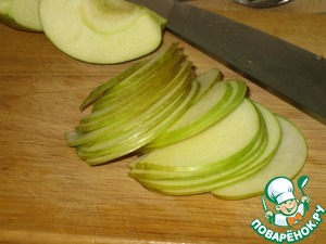 Яблоки разрезать на 4 части, удалить сердцевину и нарезать очень тонкими дольками. Я использовала тёрку Бернер.