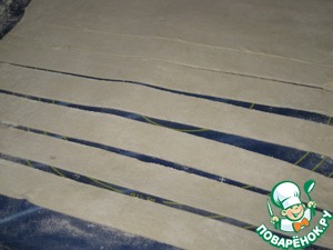 • Тесто тонко раскатать и нарезать полосочками примерно 2 см шириной и около 30 см длиной.
