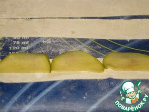 • На каждую полосочку теста выложить дольки яблок, чтобы они чуть-чуть были выше теста.