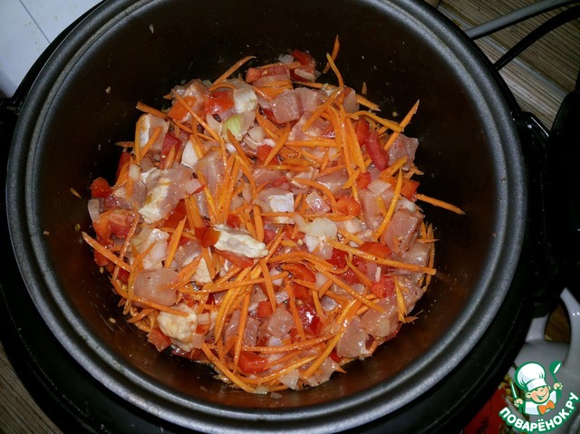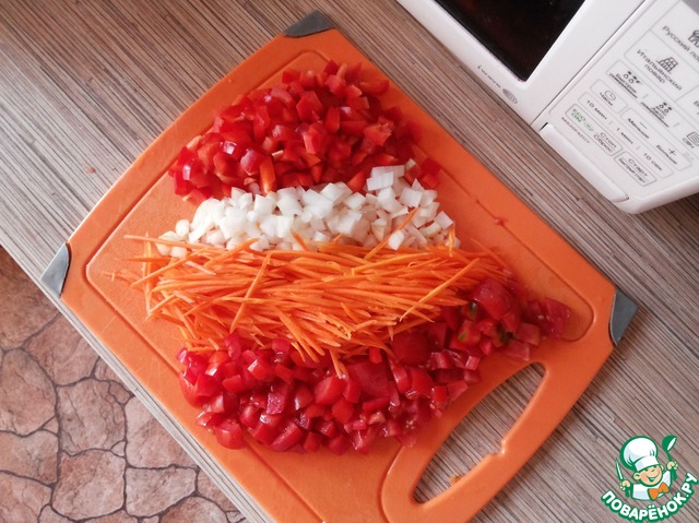 Нарезаем помидоры, перец и лук кубиками, а морковь трем на крупной терке. Выкладываем все овощи в предварительно смазанную растительным маслом чашу мультиварки и готовим на режиме Жарка 15 минут переодически помешивая.