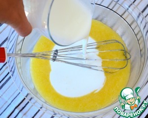 • Следом влить кефир и снова перемешать.