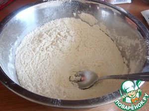 Смешать муку с солью, разрыхлителем и содой. Предваряя вопросы, скажу, что не знаю, в чем смысл использования разрыхлителя и соды. Рецепт взят из журнала, поэтому следую рецепту.