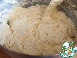 Затем в три приема по очереди добавить муку и йогурт. Т. е. добавить йогурт, слегка перемешать, добавить муку, перемешать, потом снова йогурт и т. д. Получается довольно густое тесто.