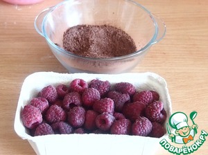 В форму выложить примерно пять ложек теста, на тесто высыпать третью часть смеси сахара и какао, выложить третью часть малины.