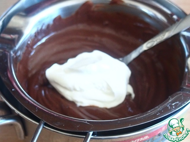 Приготовить крем. На водяной бане растопить шоколад, добавить сметану и размешать. Все, вкуснейший крем готов. Он не застывает, сохраняя кремовую консистенцию.