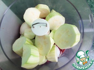 Добавить очищенные и крупно нарезанные лук и кабачки. Измельчить на большой скорости
