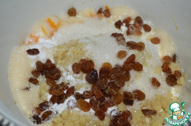 Во взбитые яйца добавить творог, пшенные хлопья, тыкву, горсть изюма, сахар и разрыхлитель. Все хорошо, но аккуратно перемешать.
