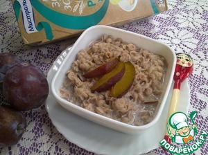 Предлагаю вам один из вариантов завтрака. Каша из рисовых хлопьев ТМ "Мистраль" отлично подойдет для детей. Сливу можно заменить на любые другие фрукты по сезону. Я варю каши на молоке - на воде они кажутся мне слишком постными. Кашу из рисовых хлопьев можно подавать как горячей, так и холодной. В горячем виде она будет прекрасным завтраком, а в холодном - великолепным десертом!