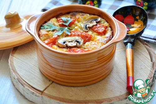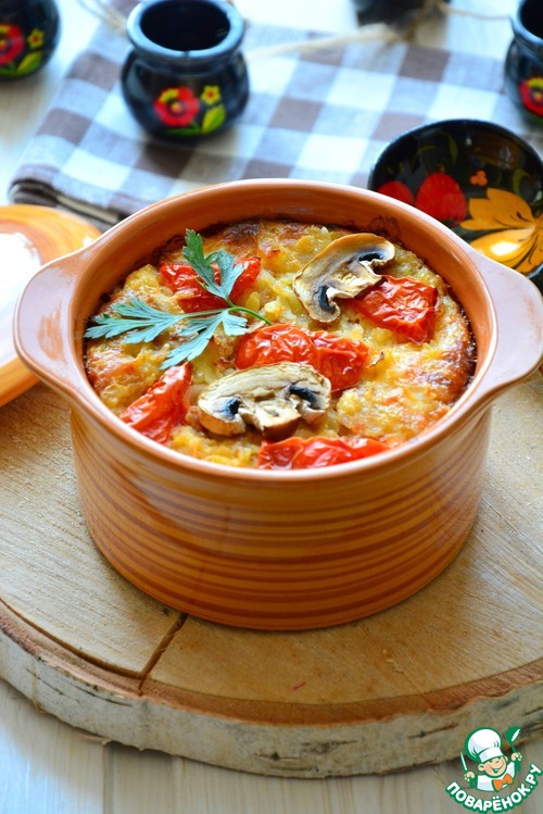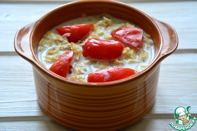 Залить молоком (или как вариант бульоном), сверху выложить кусочки помидор. Поставить в горячую духовку на 35 минут (запекать до румяной корочки). Подавать в горячем виде. Приятного аппетита!