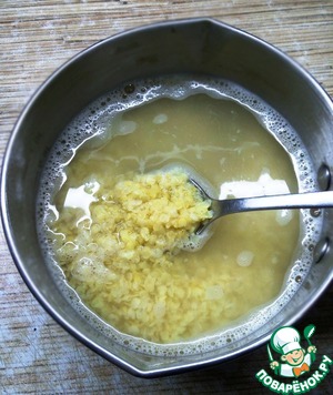 • Пшенные хлопья высыпать в кастрюльку, залить горячей водой и варить на среднем огне 3 минутки.