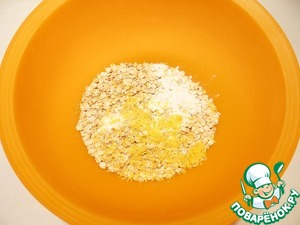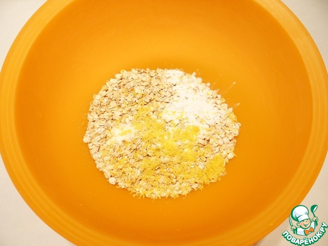 Соединяю геркулес, разрыхлитель, соль, цедру лимона, хорошо перемешиваю.