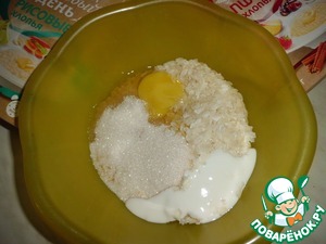 Добавляем к ним яйцо, сахар и сметану. У меня сметана достаточно жидкая, если густая, то следует ее немного разбавить молоком или кефиром. Хлопья все должны быть пропитаны ею! Отставляем минут на 10.