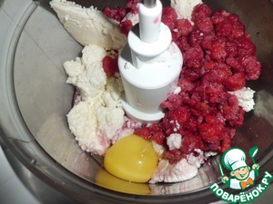 Творог перемалываем в комбайне с малиной, сахаром и яйцом.