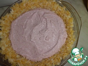 Форму смазываем сливочным маслом, посыпаем манной крупой. Выкладываем 2/3 части хлопьев. Распределяем по всей форме, не толстым слоем, формируем бортики (у меня форма высотой ок. 5 см.)