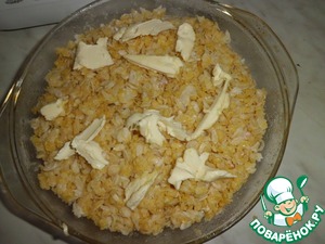 Закрываем оставшимися хлопьями и выкладываем несколько кусочков сливочного масла.