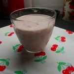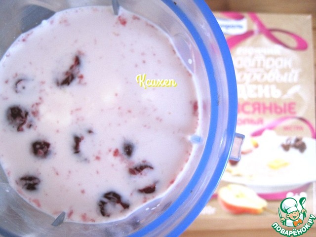 В чашу блендера выкладываем овсяные хлопья, вишню, йогурт, заливаем молоком. Взбиваем в течение нескольких секунд.