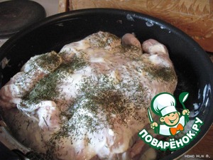 Шею закалываем шпажками. Смазываем шкурку, кто чем любит - сметаной, майонезом, солим-перчим и смазываем кожу.