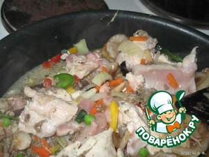 Счищаем по максимуму со скелета мясо, кладем его кусками в нагретую сковороду, добавляем масло, грибы, любые овощи, также отвариваем 2-3 яйца и откладываем их целиком в сторону.