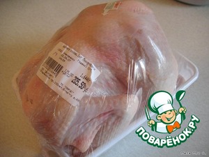 Тушку равномерно набиваем фаршем по форме курицы, по центру вагончиками выкладываем целые яйца.
