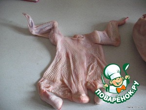 Снимаем с него чулком кожу. Это не очень легко, требует определенного навыка. Я это делаю рукой и ножом. Начинаю от хвостика: слегка надрезаю кожу, а потом аккуратно оттягиваю кожу от тушки. Где тяжело снимается, подрезаю жирок или мяско ножом, не повреждая кожу. Когда дохожу до лап, то надрезаю кожу в самом низу лапки и вынимаю ее из кожи. Крылья можно оставить вместе с кожей, так будет красивее.
