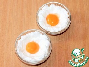 Выливаем в середину белка по одному желтку. Можно положить что то мелко порезанное, например колбаса или крупно натертый сыр. Достаточно 1-2 ст. л.