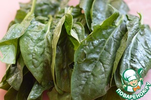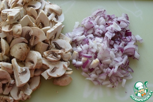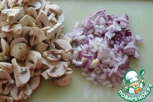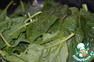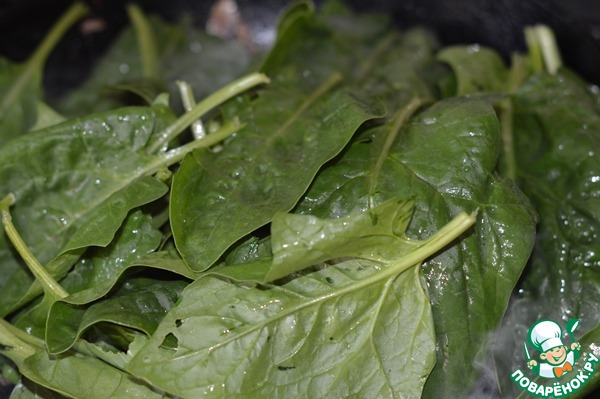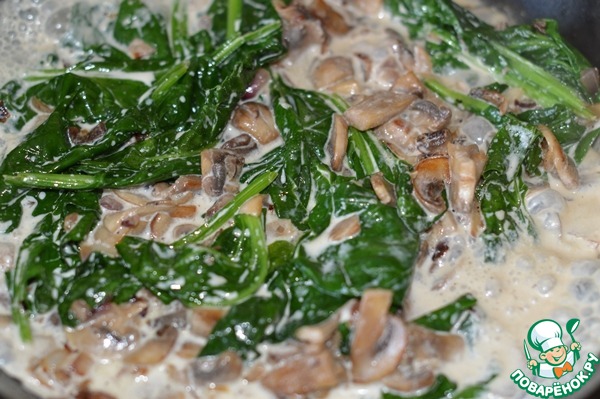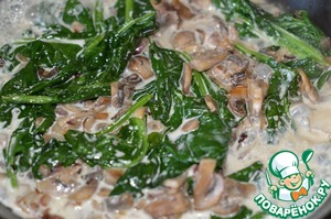 3. В сковороде разогреть масло, обжарить лук до прозрачности, затем добавить грибы, обжарить. Добавить в сковороду шпинат, перемешать, чтоб шпинат привял.