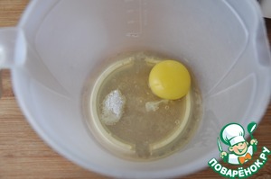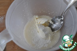 Добавляем творожный сыр, мёд, разрыхлитель, всё взбиваем. Если любите послаще, то добавьте ложку сахара.