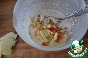 Берём яблоко, отрезаем несколько сегментов для украшения, остальное режем мелкими кубиками и добавляем к смеси.