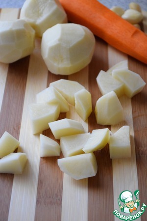 В кастрюлю (к грибам и гороху) добавить картофель через 15 минут варки.