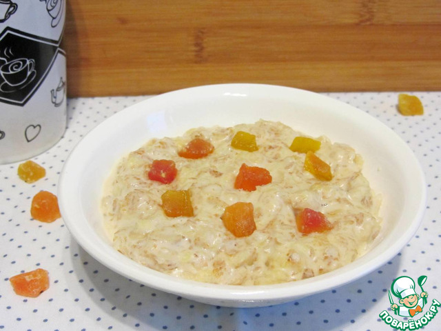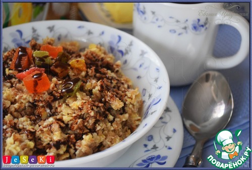 Перемешаем кашу, польем по желанию шоколадным соусом и посыпем цукатами.