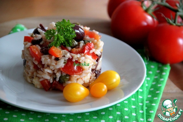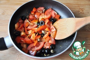 Добавляем нарезанный кубиками болгарский перец, помидоры, половинками маслины и каперсы.