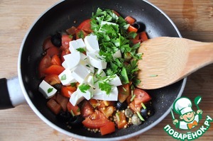 Кладём нарезанную кубиками фету и рубленную зелень петрушки. Перемешиваем.