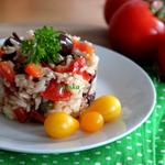 Соединяем рис и содержимое сковороды. Перемешиваем.