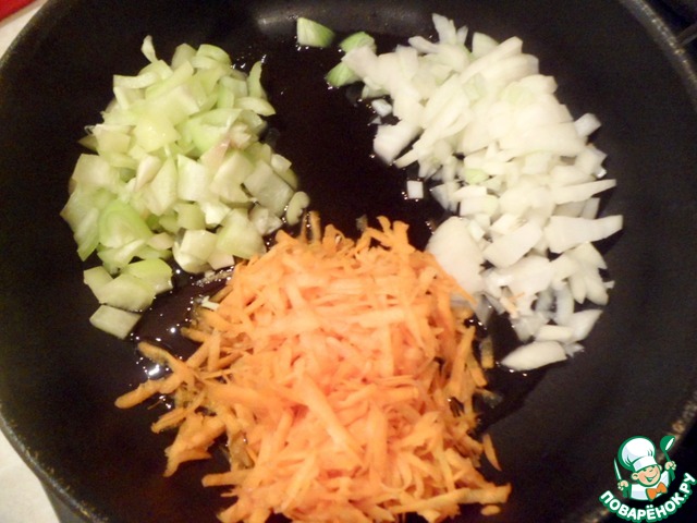 Обжарить мелко нарезанные лук, морковь и болгарский перец.