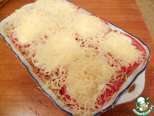Смазать помидоры сметаной и посыпать тертым сыром, запекать 15-20 минут до золотистой корочки.