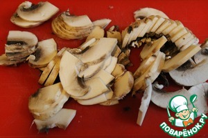 Шляпки шампиньонов нарежем тонкими ломтиками, четвертая часть пойдет на приготовление соуса, а большая часть - в кашу.