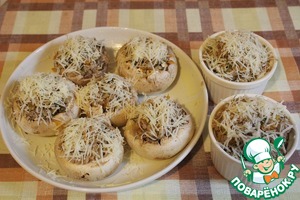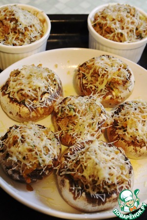 Нафаршируем гречишно-овощной смесью шляпки грибов (с горкой), остатки я выложила в рамекины, смазанные сливочным маслом, на дно - немного соевого соуса, сверху посыпаем тертым сыром. Запекаем в заранее нагретой до 180 град. духовке до подрумянивания.