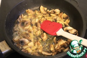 Добавим ломтики грибов и продолжим жарить, пока из грибов не выпарится вся жидкость.